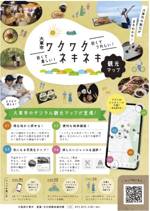 大東市では、市内の飲食店、観光スポット、体験施設を一つにまとめたデジタル観光マップ「大東市ワクワクネキネキ観光マップ」ができました。